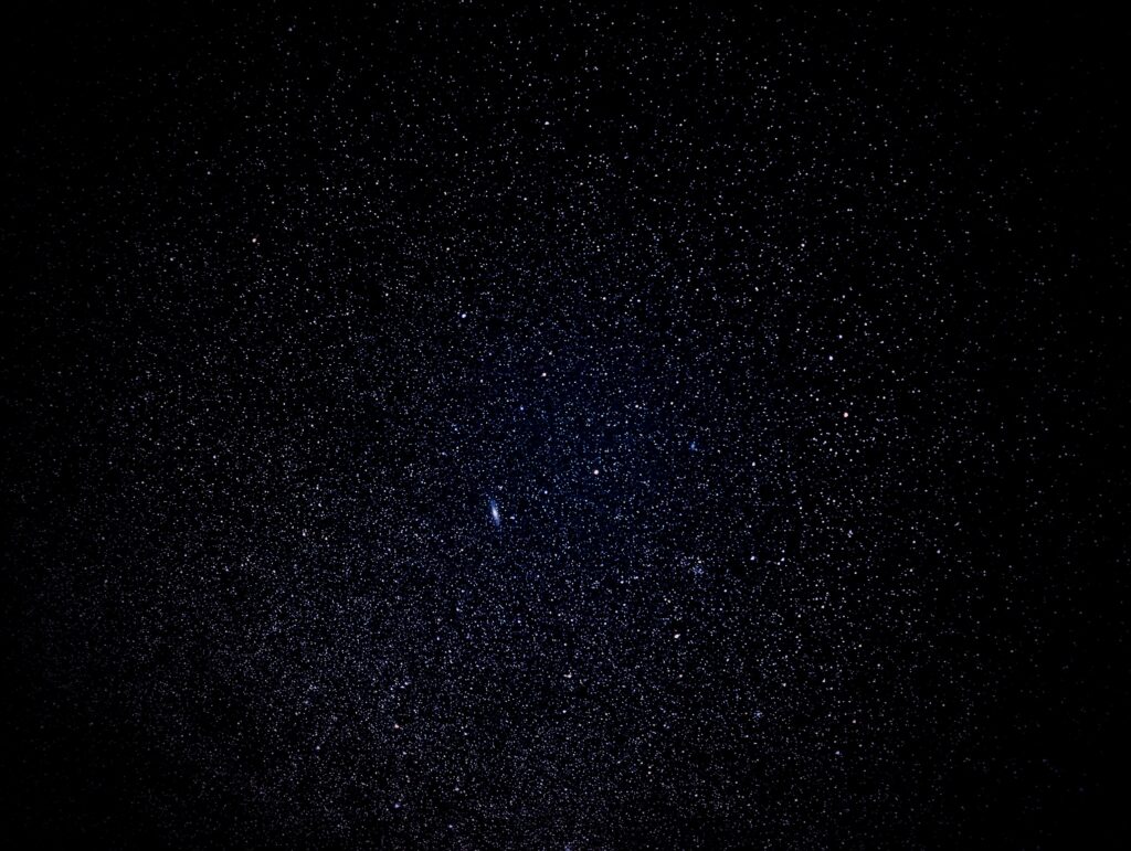 なるほど、白いシミのような楕円であれば撮影可能のようですね。まだ、夏の終わりですが、深夜からアンドロメダ銀河が観測できます。実際のところ、鵜倉園地の綺麗な星空でもアンドロメダ銀河は肉眼では見えませんでした。肉眼では見えませんが、スマートフォンをGoogle Pixel 10 Pro XLに買い替えたので、天体観測モードでアンドロメダ銀河を撮影したところ、見事に写りました。中央やや左のシミのようなものがアンドロメダ銀河です。