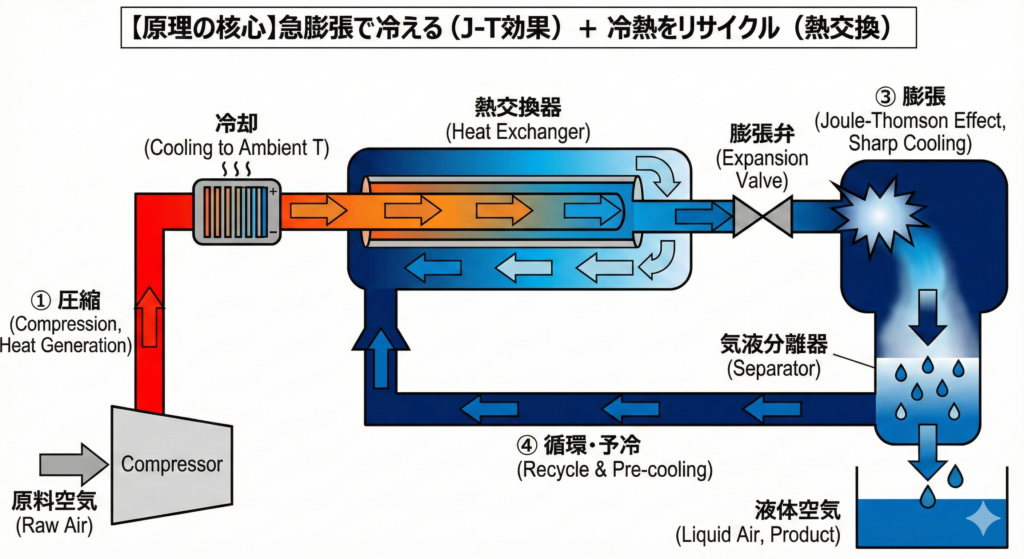 一言で言うと、**「気体をギュウギュウに圧縮してから急に広げると冷たくなる性質を利用し、それを何度も繰り返して極低温(液体)にする方法」**です。