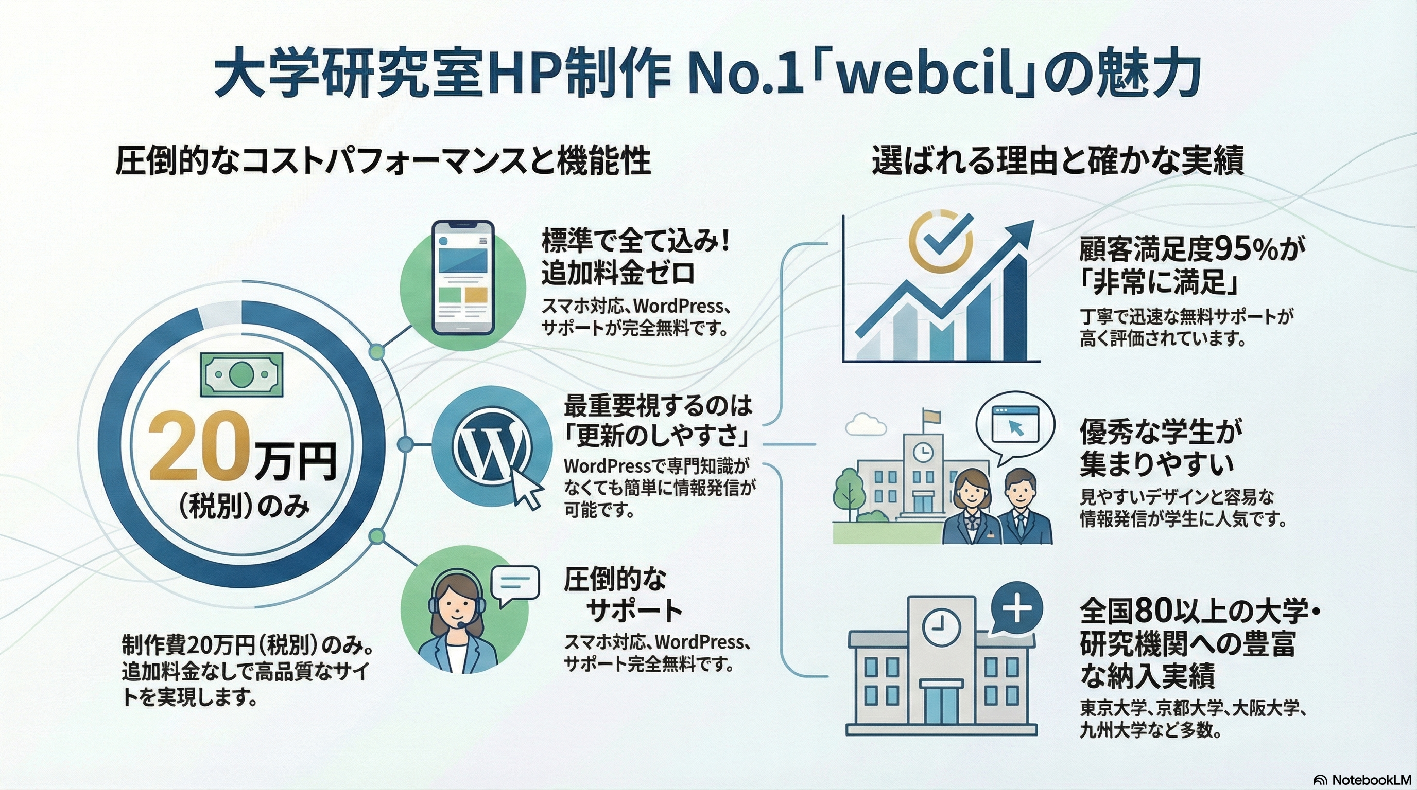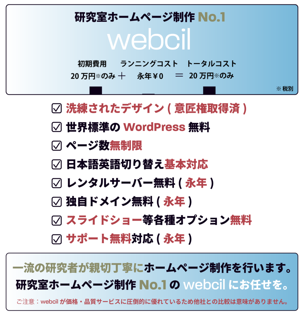 - 大学研究室ホームページ作成・制作における圧倒的No.1のwebcil 🄬 は20万円(税別)のみで、スマートフォン対応はもちろんWordPress対応やサポート対応も完全無料です。研究室ホームページでお困りの方は迷わずwebcilにお問い合わせください。科研費サイトや学会サイト、研究者様の個人サイト、大学内の小規模組織や研究会などのサイトを幅広く対応させていただいております。