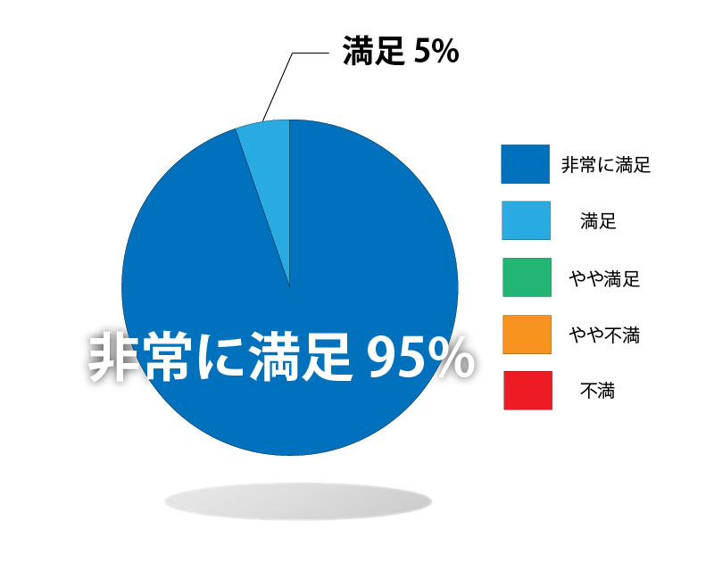 webcilを半年以上ご利用いただいているお客様全員を対象に、その後の運用も含めてお客様満足度アンケートを実施させていただきました(2019年3月15日実施)。その結果、なんと95%の方が非常に満足という回答が得られました。webcilの無料の運営サポートや丁寧で迅速な対応がとても評価されています。ホームページの運用に不安な皆様もどうぞ安心して「圧倒的」満足度のwebcilにお申し込みください。